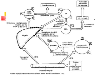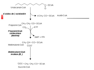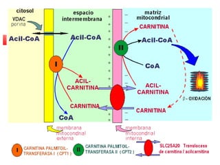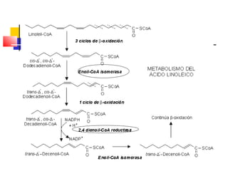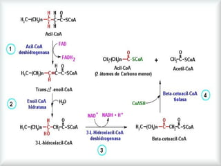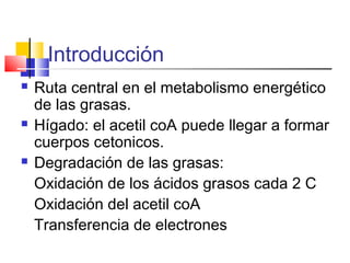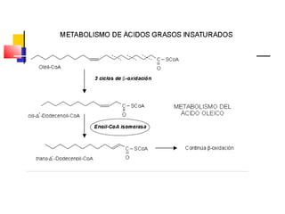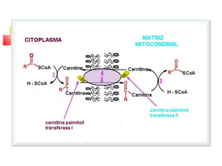El documento detalla el metabolismo de los lípidos, incluyendo la degradación y oxidación de ácidos grasos, la movilización de triglicéridos y la formación de cuerpos cetónicos en el hígado. Se describe el proceso de β-oxidación en las mitocondrias, así como la regulación hormonal y enzimática involucrada. Además, se aborda la conversión de acetil-CoA en cuerpos cetónicos y su utilización en tejidos periféricos.