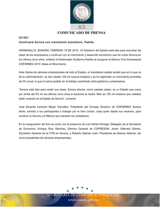 El Gobernador de Sonora, Guillermo Padrés, inauguró el Décimo Foro Empresarial COPARMEX 2015 en Hermosillo, Sonora. Padrés señaló que el gobierno está listo para escuchar las ideas de los empresarios para continuar con el crecimiento económico de 5% anual en Sonora, donde se han creado 120 mil nuevos empleos en los últimos cinco años. El Presidente de COPARMEX Sonora Norte exhortó a los participantes a trabajar por el bien común de Sonora y México.