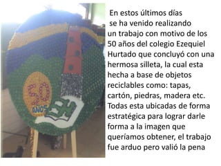 En estosúltimos días se ha venido realizando un trabajo con motivo de los 50 años del colegio Ezequiel Hurtado que concluyó con una hermosa silleta, la cual esta hecha a base de objetos reciclables como: tapas, cartón, piedras, madera etc.Todas esta ubicadas de forma estratégica para lograr darle forma a la imagen que queríamos obtener, el trabajo fue arduo pero valió la pena