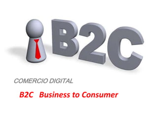 El documento describe el comercio digital B2C, que implica transacciones entre empresas y consumidores a través de plataformas virtuales para compras en línea. Ofrece ventajas como compras rápidas y cómodas, precios actualizados y centros de atención al cliente en línea, pero también presenta desafíos como crear tráfico y fidelidad de clientes, y no poder analizar completamente el consumo. En conclusión, B2C se refiere a las estrategias que las empresas usan para llegar directamente a los clientes mediante ventas electr