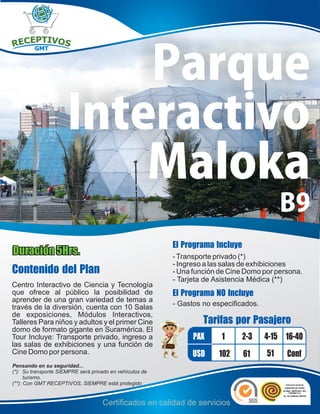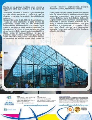Maloka es un parque temático interactivo sobre ciencia y tecnología ubicado en Bogotá, Colombia. El parque ofrece más de 200 exhibiciones educativas repartidas en 10 salas sobre temas como la vida, el universo y la tecnología. El tour incluye transporte privado, acceso a las salas y una función de cine domo, y puede durar hasta 5 horas.