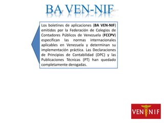 Este documento establece los criterios para el reconocimiento de la inflación en los estados financieros preparados de acuerdo con las Normas Internacionales de Información Financiera en Venezuela. Indica que las entidades deben aplicar la NIC 29 o la Sección 31 de la NIIF para PYMES para reconocer los efectos de la inflación cuando esta supere el 1% anualmente. También especifica los índices a usar para reexpresar cifras de años anteriores a 2007 y que si la inflación no se reconoce, se debe revelar la no reconocida.