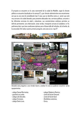 El documento analiza un proyecto de vivienda ubicado en Medellín. Se describe que el proyecto se encuentra en una zona con buenos servicios y equipamientos a pesar de haber cambiado su carácter. El proyecto consta de 8 edificios con 160 apartamentos construidos en 4 etapas. Se señalan algunas deficiencias en la distribución de los espacios y la falta de innovación en los diseños. Finalmente, se proponen algunas hipótesis para mejorar la calidad de la vivienda.
