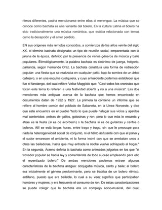 La bachata se originó en la República Dominicana como música popular bailable de las clases pobres, interpretada con guitarra. Comenzó como reuniones sociales informales llamadas "bachatas" que incluían música, baile y consumo de alcohol. Aunque el bolero era popular, la bachata desarrolló su propio estilo melancólico sobre temas de amor y pérdida. No fue aceptada por la elite hasta décadas después, cuando ganó popularidad masiva en la década de 1980.