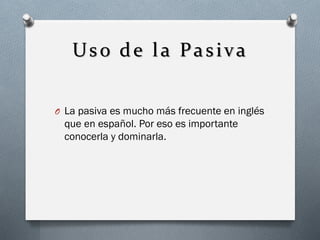 El documento describe el uso de la voz pasiva en inglés. Explica que la pasiva se usa más en inglés que en español y es importante dominarla. Luego detalla tres usos comunes de la pasiva: 1) cuando se quiere enfocar en el complemento más que en el sujeto, 2) cuando el sujeto es desconocido, y 3) cuando el sujeto es obvio. Finalmente, ofrece instrucciones para convertir oraciones activas a pasivas.