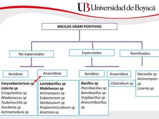 El documento proporciona un análisis exhaustivo de los bacilos gram positivos, centrándose principalmente en el género Corynebacterium, sus características, investigaciones sobre su patogenicidad y las enfermedades que pueden causar, como la difteria. También se discuten métodos diagnósticos y tratamientos, además de la epidemiología y prevención de estas infecciones, resaltando la importancia de la vacunación y el manejo en pacientes inmunocomprometidos. Se capta la diversidad de especies dentro del género y sus implicaciones clínicas en diferentes contextos.