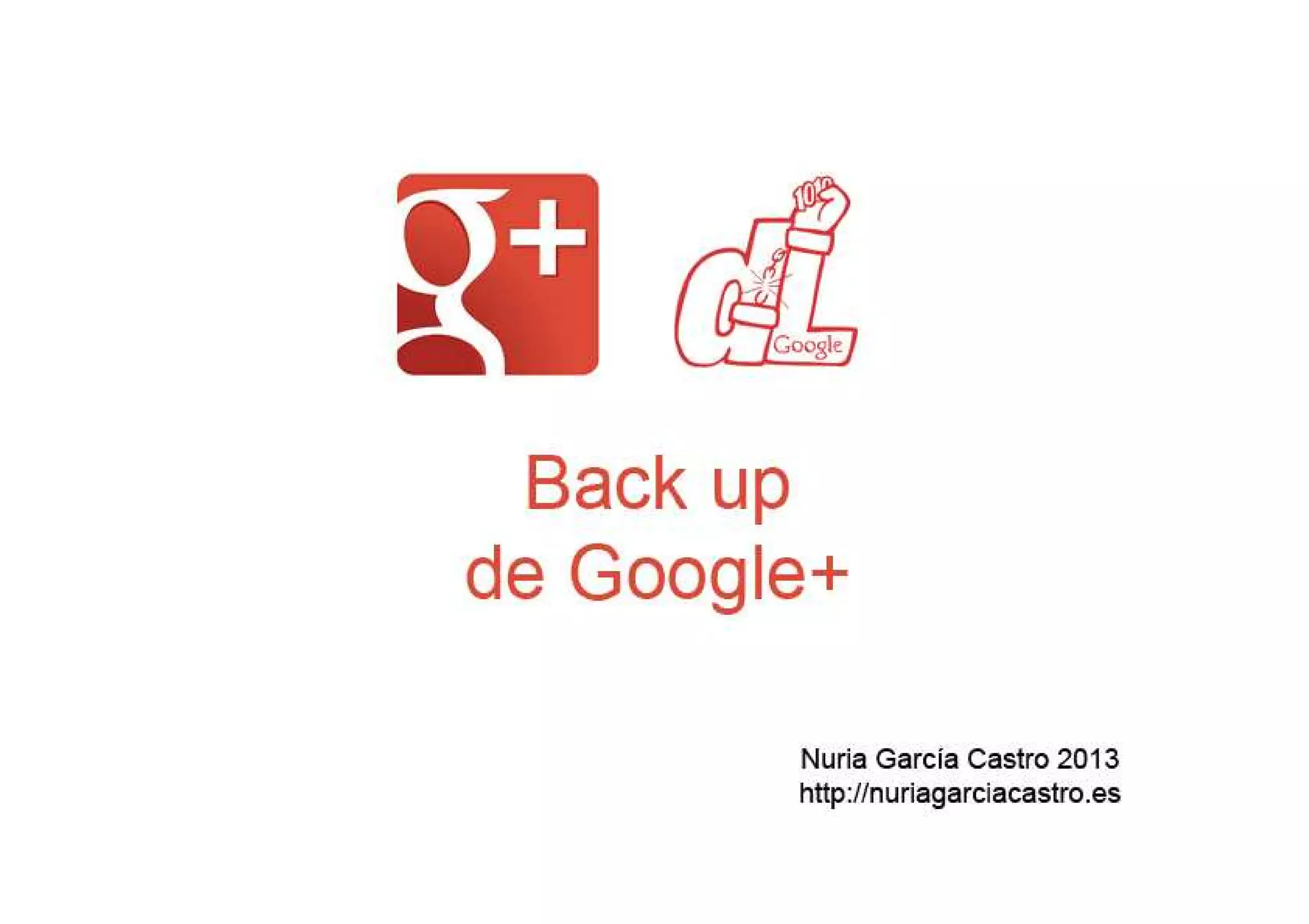 Este documento explica dos métodos para realizar copias de seguridad de datos de Google+. Se puede hacer una copia de seguridad completa de todos los datos a través de Google+ o Google Takeout, o se pueden seleccionar partes específicas como fotos, perfiles y publicaciones. El proceso implica seleccionar los datos que se desean guardar, crear un archivo y descargarlo después de que se complete.