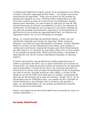 Este documento proporciona una breve historia y descripción de BackTrack, una distribución de Linux diseñada para la auditoría de seguridad y las pruebas de penetración. Se originó a partir de la fusión de las distribuciones Auditor y WHax, y ha evolucionado a través de varias versiones principales. Actualmente incluye más de 300 herramientas de seguridad organizadas en categorías como escaneo de puertos, análisis forense y auditoría inalámbrica. Es popular entre profesionales de la seguridad debido a