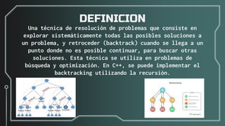 El backtracking es una técnica de resolución de problemas que consiste en explorar sistemáticamente todas las posibles soluciones a un problema, retrocediendo cuando no es posible continuar para buscar otras soluciones. Permite encontrar todas las soluciones posibles a un problema de manera recursiva. Puede ser efectivo pero también ineficiente para problemas con muchas soluciones o que requieren gran memoria.