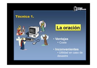 Este documento describe varias técnicas para realizar copias de seguridad de entornos virtuales. La técnica tradicional implica tratar cada máquina virtual como un servidor físico e instalar agentes en cada una. Los snapshots de ESX permiten exportar la imagen completa de una máquina virtual con menos recursos. El consolidated backup de VMware no requiere agentes y realiza copias de seguridad a nivel de archivo sin usar recursos del servidor ESX. Omega Peripherals combina esta técnica en su herramienta INST& para automatizar el proceso de