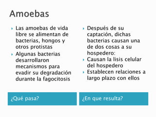 Las bacterias patógenas pueden infectar amoebas de vida libre y establecer relaciones simbióticas a largo plazo. Algunas bacterias evaden la degradación durante la fagocitosis y causan la lisis del hospedero o establecen una simbiosis obligada después de muchas generaciones. La bacteria reduce la virulencia y depende del hospedero, suprimiendo genes que codifican enzimas importantes.