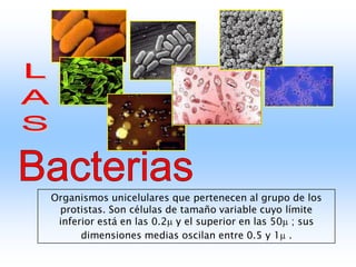 Este documento trata sobre las bacterias. Resume sus principales características como organismos unicelulares de tamaño variable que se clasifican según su forma en cocos, bacilos, vibrios y espirilos. Describe su estructura, que incluye la cápsula, pared, membrana, ribosomas, ADN y otros elementos. Explica que se reproducen por bipartición tras la replicación del ADN y que también pueden experimentar mutaciones. Finalmente, menciona los antibióticos como sustancias que tratan infecciones bacterianas actu