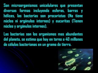 Este documento describe diferentes tipos de bacterias como Escherichia coli, Salmonella, Shigella y Listeria monocytogenes, las cuales pueden causar infecciones intestinales y sistémicas. También describe las características de bacilos, cocos y vibriones, señalando que algunos son patógenos mientras que otros son inofensivos o benéficos. Finalmente, brinda detalles sobre las formas, hábitats y síntomas asociados a cada bacteria.