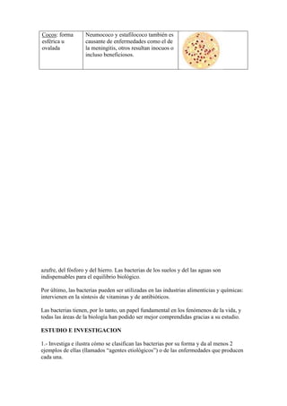 Este documento describe la clasificación y características de las bacterias. Las bacterias se clasifican por su forma (cocos, bacilos, espirilos, vibrios) y por su agrupación (diplococos, estreptococos, estafilococos). Se proporcionan ejemplos como el neumococo y estafilococo, causantes de enfermedades como la meningitis. Las bacterias juegan un papel fundamental en la naturaleza y en la industria, aunque algunas son patógenas y causan enfermedades.