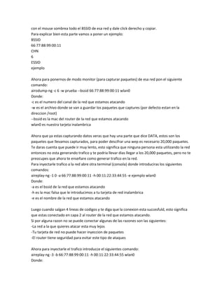 Este documento proporciona instrucciones detalladas para hackear una red WiFi protegida con WEP mediante el uso de herramientas como airodump-ng, aireplay-ng y aircrack-ng. Explica cómo cambiar la dirección MAC, monitorear las redes, inyectar tráfico para capturar paquetes, y descifrar la clave WEP al encontrarla.