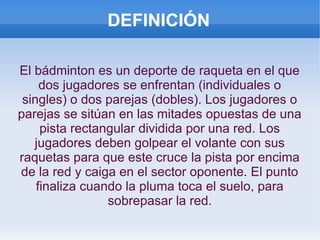El bádminton es un deporte de raqueta entre dos jugadores o parejas separados por una red, cuyo objetivo es golpear el volante para que caiga en el lado del oponente. Surgió en la India y llegó a Inglaterra en 1873, donde se formó el primer club de bádminton. Desde 1992 es un deporte olímpico. Se juega con una raqueta y un volante de plumas en una cancha rectangular.