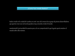 Badoo fue creado en 2006 en Londres por un grupo de desarrolladores jóvenes que querían crear una red social para compartir información sobre uno mismo pero manteniendo la privacidad de los usuarios. La palabra "Badoo" significa "Yo estoy aquí". Es un portal gratuito para conocer gente donde los usuarios pueden crear perfiles con sus datos e intereses y unirse a grupos con los mismos intereses.