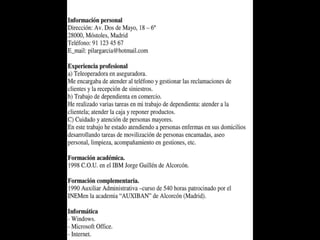 El documento explica qué es un currículum vitae y por qué es importante para buscar empleo. Un CV es una tarjeta de presentación que resume la trayectoria personal y profesional de una persona. Los empleadores lo usan como primera impresión del candidato. Un CV debe ser conciso, no mayor a 2 páginas, y presentarse de manera clara y positiva para convencer al empleador del interés y cualificaciones del candidato.