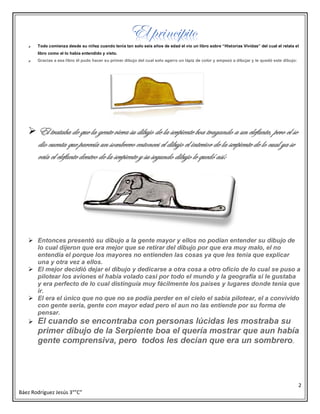 El documento narra la historia de un piloto que sufrió un accidente en el desierto del Sahara y conoció a un niño llamado el Principito. El Principito le pidió al piloto que dibujara un cordero, a lo que el piloto intentó varias veces hasta que logró uno que satisfizo al Principito. El Principito explicó que venía de otro planeta y que tenía que deshacerse de las semillas malas que infectaban su planeta.