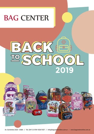 El documento es un catálogo de mochilas y accesorios escolares con una variedad de productos de marcas como LOL, Peppa Pig, Frozen, Barbie, entre otras. Se presenta información sobre precios y características de los artículos disponibles, incluyendo mochilas con carro, luncheras y cartucheras. El catálogo incluye contactos y sitio web de la tienda para más información.