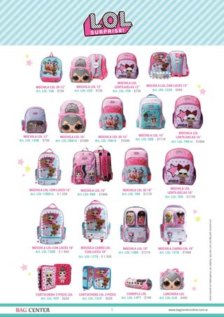 Este documento contiene una lista de artículos identificados por códigos como "Art. LOL-1SB", junto con sus precios respectivos. También incluye descripciones e imágenes de mochilas temáticas de diferentes películas como Los Increíbles, Ralph y Spiderman, con precios que van desde $329 hasta $700.