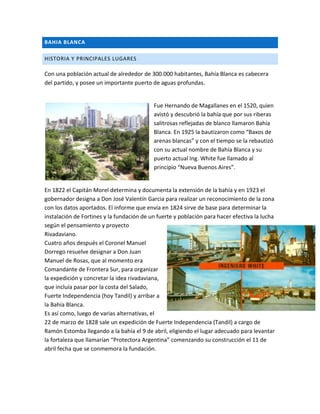 Bahía Blanca fue fundada en 1828 y se encuentra en la provincia de Buenos Aires. Algunos de los lugares principales de la ciudad incluyen el Palacio Municipal, el Teatro Municipal inaugurado en 1913, y la Biblioteca Rivadavia fundada en 1882. La Catedral Nuestra Señora de la Merced data de 1900 y se ubica en el centro histórico junto a otros edificios importantes.