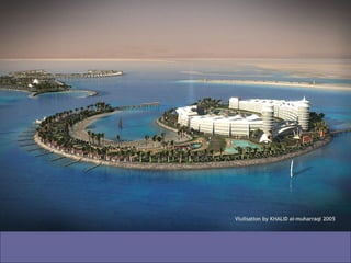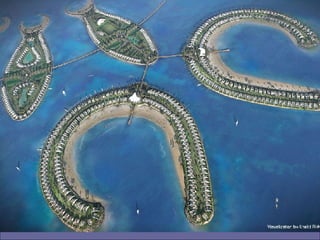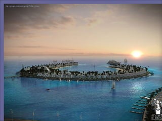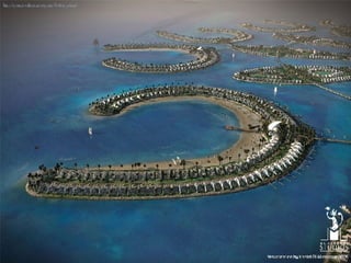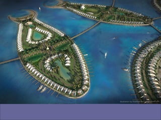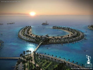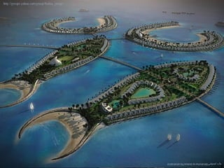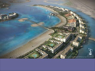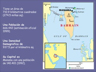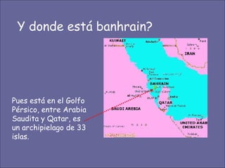 Banhrain es un archipiélago en el Golfo Pérsico entre Arabia Saudita y Qatar, compuesto de 33 islas con un área total de 710.9 km2. Su capital es Manama, con una población de 140,401 habitantes. El documento describe el proyecto de Al Durrat, un complejo turístico, arquitectónico y económico que se está construyendo en el suroeste de Banhrain, el cual incluirá islas artificiales, hoteles, residencias, campos de golf y otras instalaciones.