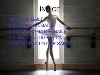 El documento proporciona información sobre diferentes tipos de baile como flamenco, danza española, hip hop, ballet, entre otros. Explica brevemente los orígenes, características y pasos básicos de cada uno. También incluye secciones sobre la historia del baile, una galería fotográfica y preguntas para evaluar los conocimientos del lector.