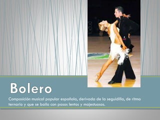 Este documento resume brevemente diferentes géneros musicales y bailes populares de diversas partes del mundo, incluyendo América Latina, España y Europa. Describe el origen y características principales de estilos como la bachata, conga, cumbia, chachachá, chotis, danzón, foxtrot, mambo, merengue, paso doble, pericón, polca, salsa, sevillanas, son cubano, swing y tango.