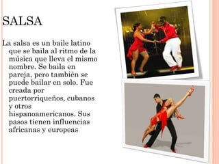 El documento describe varios bailes de salón latinos como la salsa, el merengue, el tango y el pasodoble. La salsa se originó en Puerto Rico y Cuba y se baila al ritmo de la música salsa. El merengue es el baile nacional de la República Dominicana y tiene pasos sencillos. El tango es un baile y género musical de Argentina y Uruguay que se baila en parejas abrazadas. El pasodoble imita los movimientos del torero y el toro.