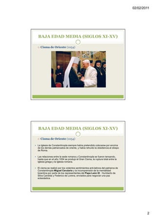 El documento resume la Baja Edad Media (siglos XI-XV) en Europa. Durante este periodo ocurrieron el Cisma de Oriente que dividió la Iglesia católica y ortodoxa, las Cruzadas para proteger Tierra Santa, y el establecimiento de órdenes religiosas como los Templarios y franciscanos. También hubo reformas monásticas con Cluny y San Bernardo, y el Cisma de Occidente dividió la sede papal entre Roma y Aviñón.