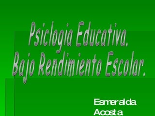 El documento habla sobre el bajo rendimiento escolar, definido como la dificultad que presentan los estudiantes en diferentes áreas académicas. Esto causa desinterés en el aprendizaje y puede llevar a la repetición de grados o deserción. El bajo rendimiento perjudica a la familia, comunidad y país. Se ven afectados por factores fisiológicos, pedagógicos, sociales y psicológicos.