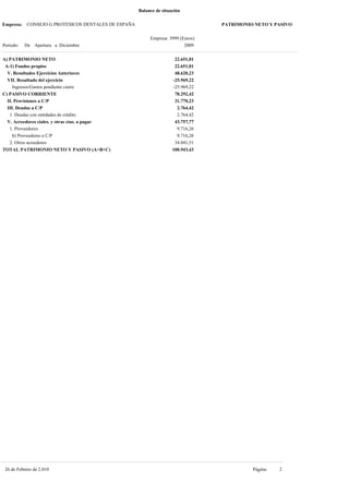 Este balance de situación resume la situación financiera de una empresa de prótesis dentales en España al final de 2009. Los activos totales de la empresa fueron de 100,943.43 euros, con la mayor parte del activo corriente (86,367.91 euros) compuesto por deudores comerciales. El patrimonio neto fue de 22,651.01 euros. El pasivo corriente fue la parte más grande con 78,292.42 euros, incluyendo provisiones a corto plazo y acreedores comerciales.