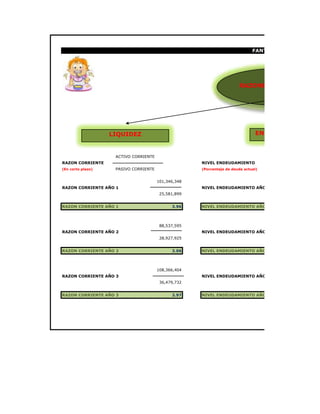 El documento presenta los balances generales proyectados de los años 1 al 6 de Fantastic Food S.A.S., incluyendo activos, pasivos y patrimonio. Los activos aumentan cada año debido al crecimiento del negocio. El pasivo disminuye en los últimos años gracias a la reducción de deudas. El patrimonio aumenta constantemente, lo que demuestra una mejora en la situación financiera de la compañía a lo largo del tiempo.
