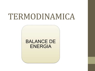 Este documento define el balance de energía y los diferentes tipos de sistemas relacionados con él. Explica que el balance de energía se refiere al movimiento o manifestación de energía dentro de un sistema, que puede involucrar trabajo mecánico o calor. Luego describe sistemas abiertos, cerrados y aislados, así como los términos calor, trabajo y energía interna. Finalmente, indica que el balance de energía también se puede aplicar a una superficie.