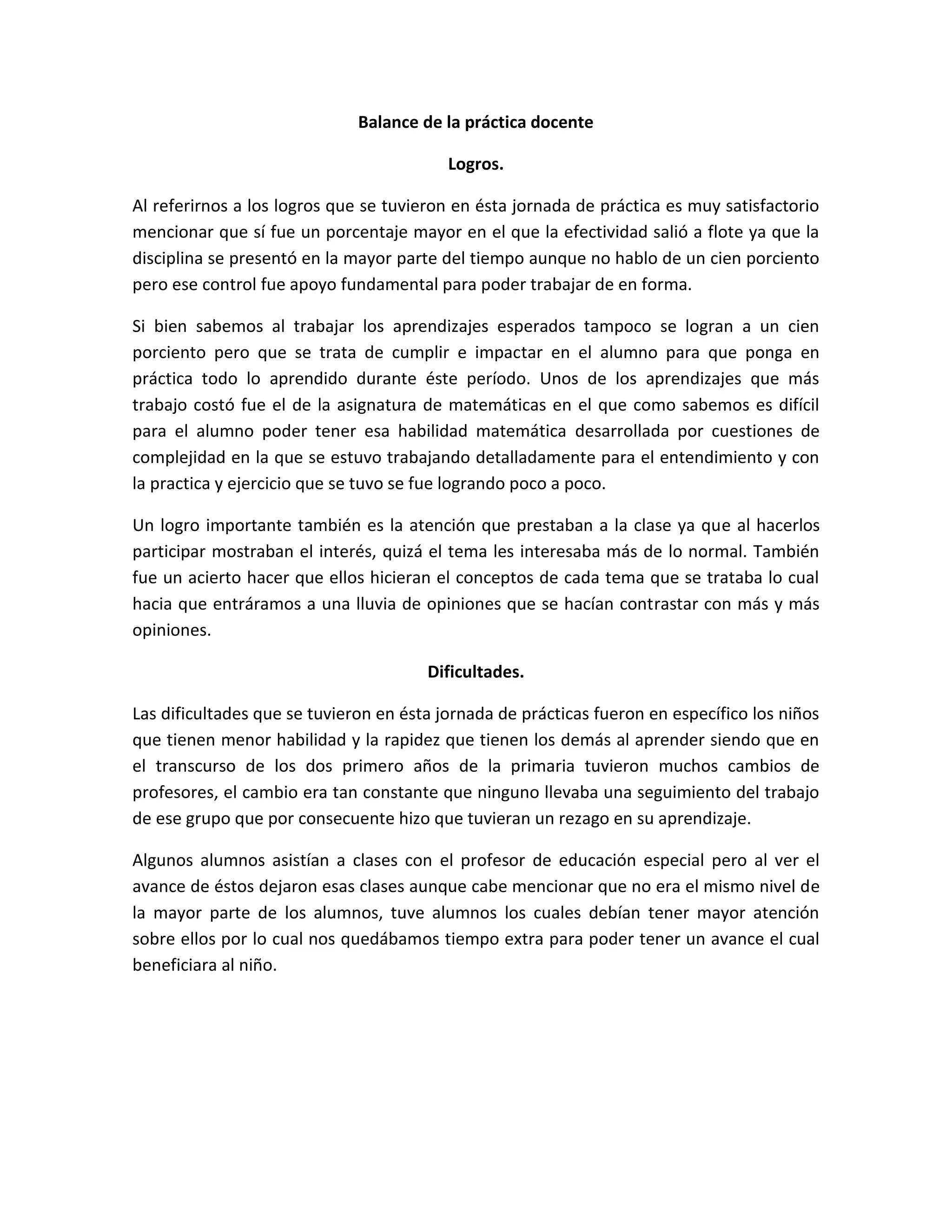 El resumen describe los logros, dificultades y retos de una práctica docente. Entre los logros se menciona que hubo buen control de disciplina y participación de los estudiantes, aunque algunos aprendizajes como las matemáticas requirieron más esfuerzo. Las dificultades incluyeron estudiantes con menor habilidad y rezago debido a cambios frecuentes de maestros. Un reto fue aprender estrategias para ayudar a estudiantes con menos habilidad y organizar el tiempo para atender a todos.
