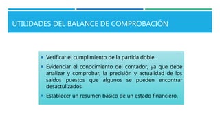El balance de comprobación es un instrumento financiero que lista los débitos, créditos y saldos de cuentas para visualizar y resumir la situación financiera de una empresa. Se prepara a partir del libro mayor y sirve para verificar la partida doble, comprobar la precisión de los saldos y establecer un resumen básico del estado financiero. El balance de comprobación ajustado incluye los saldos después de realizar los asientos de ajuste para representar las cifras reales y poder elaborar los estados financieros.