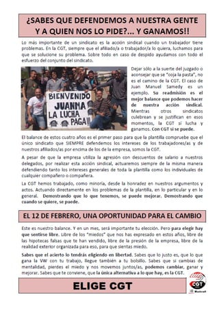 BALANCE ELECCIONES SINDICALES 2015 CGT SEAT ¿AUN CREES QUE TODOS LOS SINDICATOS SON IGUALES.? SABES QUE HEMOS DADO LA MEJOR INFORMACIÓN A LA PLANTILLA. ¿AUN CREES QUE SOMOS EL SINDICATO QUE NUNCA FIRMA NADA? ¿AUN PIENSAS QUE FIRMARLO TODO, ES LO MEJOR? ¿SABES QUE DEFENDEMOS A NUESTRA GENTE Y A QUIEN NOS LO PIDE? ... Y GANAMOS EL 12 DE FEBRERO UNA OPRTUNIDAD PARA EL CAMBIO. ELIGE CGT