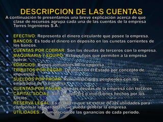 El documento explica la diferencia entre cuentas de activo y pasivo corrientes y no corrientes. Las cuentas de activo corriente son aquellas que pueden convertirse rápidamente en efectivo, como efectivo, cuentas por cobrar y bancos. Las cuentas de activo no corriente no pueden convertirse fácilmente en efectivo, como terrenos, edificios y maquinaria. Las cuentas de pasivo corriente son deudas que se cancelarán en menos de un año, como tributos por pagar, sueldos
