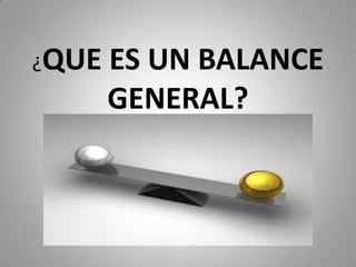 El documento define un balance general como un estado financiero que muestra los recursos (activo) de los que dispone una entidad y las fuentes (pasivo y capital contable) de dichos recursos a una fecha determinada. Explica que el balance general consta de tres secciones principales - activo, pasivo y capital contable - y describe brevemente cada sección y sus clasificaciones más importantes como activo circulante, activo no circulante, pasivo circulante, pasivo no circulante, capital contable contribuido y capital contable ganado.