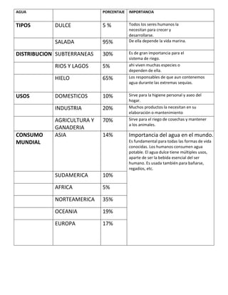 Este documento resume la importancia del agua en el mundo. Afirma que el agua es fundamental para todas las formas de vida y que los humanos consumen principalmente agua potable. Explica que el agua dulce tiene múltiples usos además de ser la bebida esencial, como el riego y el baño. Además, proporciona estadísticas sobre la distribución y el uso del agua, señalando que la mayor parte del agua dulce se utiliza para la agricultura y la ganadería y que Asia consume la mayor