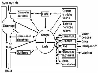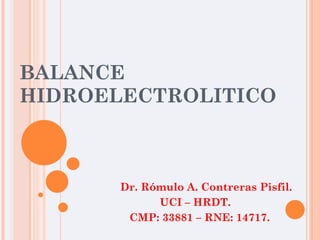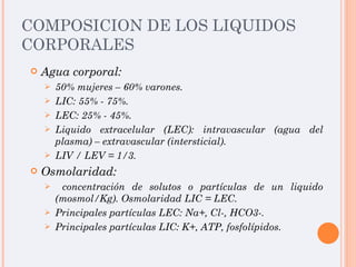 Este documento resume los principales conceptos relacionados con el balance hidroelectrolítico y la homeostasis del sodio y el agua en el cuerpo. Explica la composición de los líquidos corporales, el balance hídrico, y las causas y tratamientos de la hipo e hipernatremia. Además, analiza los mecanismos de regulación del volumen de los líquidos corporales y la excreción de sodio para mantener el equilibrio entre las entradas y pérdidas de este electrolito.
