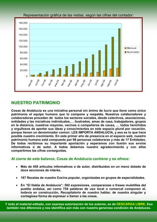 El documento resume el primer año de funcionamiento del sitio web "Cosas de Andalucía" desde octubre de 2008 a septiembre de 2009. Los datos muestran que hubo 161,947 visitas totales, con un aumento constante cada mes, especialmente en verano. El sitio cuenta con contribuciones de 98 colaboradores y más de 17 entidades, y ofrece más de 450 artículos, 187 recetas, y expresiones populares de Andalucía.