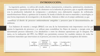 El documento aborda el balance de materia y energía en ingeniería química, destacando su importancia en el diseño y operación de procesos industriales. Se exploran conceptos fundamentales como la conservación de la masa, la densidad, la ley de gases ideales y diferentes tipos de procesos químicos, así como métodos para calcular conversiones y composiciones porcentuales. Además, se analizan los balances de materia y energía en sistemas abiertos y cerrados, enfatizando la ley de conservación de la energía.