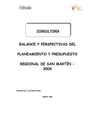 El documento analiza el balance y perspectivas del planeamiento y presupuesto regional de San Martín para el año 2004. Se revisa el desempeño económico de la región y los objetivos planteados para el próximo año, priorizando proyectos de infraestructura, educación y salud.
