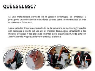 El documento describe el Balanced Scorecard (BSC), una metodología de gestión estratégica que utiliza objetivos e indicadores de desempeño en 4 perspectivas: financiera, clientes, procesos internos y aprendizaje y crecimiento. El BSC permite traducir la estrategia de una organización en objetivos claros que están alineados e integrados a través de las 4 perspectivas.