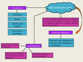 El Balanced Scorecard es una herramienta de gestión que traduce la estrategia de una empresa en objetivos medibles a través de indicadores en cuatro perspectivas: financiera, cliente, procesos internos e innovación. Permite establecer la visión y misión de una empresa y alinear los objetivos estratégicos a través de metas e iniciativas. Requiere la participación de toda la organización para lograr el éxito esperado.