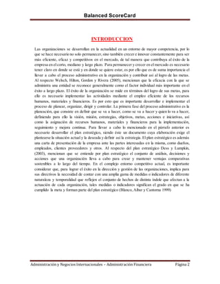 El documento presenta información sobre el Balanced Scorecard (BSC). El BSC es una herramienta de gestión estratégica que traduce la estrategia de una organización en objetivos e indicadores clave de desempeño en cuatro perspectivas: financiera, cliente, procesos internos y aprendizaje y crecimiento. El BSC ayuda a las organizaciones a mejorar el desempeño mediante la alineación de las actividades de todos los niveles con la visión y estrategia establecidas.