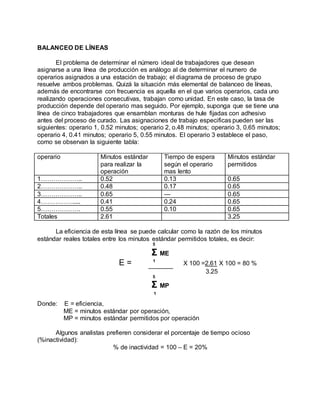 Este documento trata sobre el balanceo de líneas de producción. Explica que el balanceo implica determinar el número óptimo de trabajadores asignados a cada estación de trabajo para maximizar la eficiencia. Luego presenta un ejemplo numérico de cinco trabajadores ensamblando productos y calcula la eficiencia de la línea. Finalmente, discute conceptos como el tiempo estándar de cada operación y formas de mejorar la asignación de trabajadores.