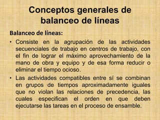 El documento habla sobre conceptos generales de balanceo de líneas. Explica que el balanceo de líneas consiste en agrupar actividades secuenciales de trabajo en centros de trabajo para aprovechar al máximo la mano de obra y el equipo y reducir el tiempo ocioso. También describe métodos para realizar un balanceo de línea como especificar relaciones secuenciales, determinar el tiempo de ciclo requerido y asignar tareas a estaciones de trabajo.